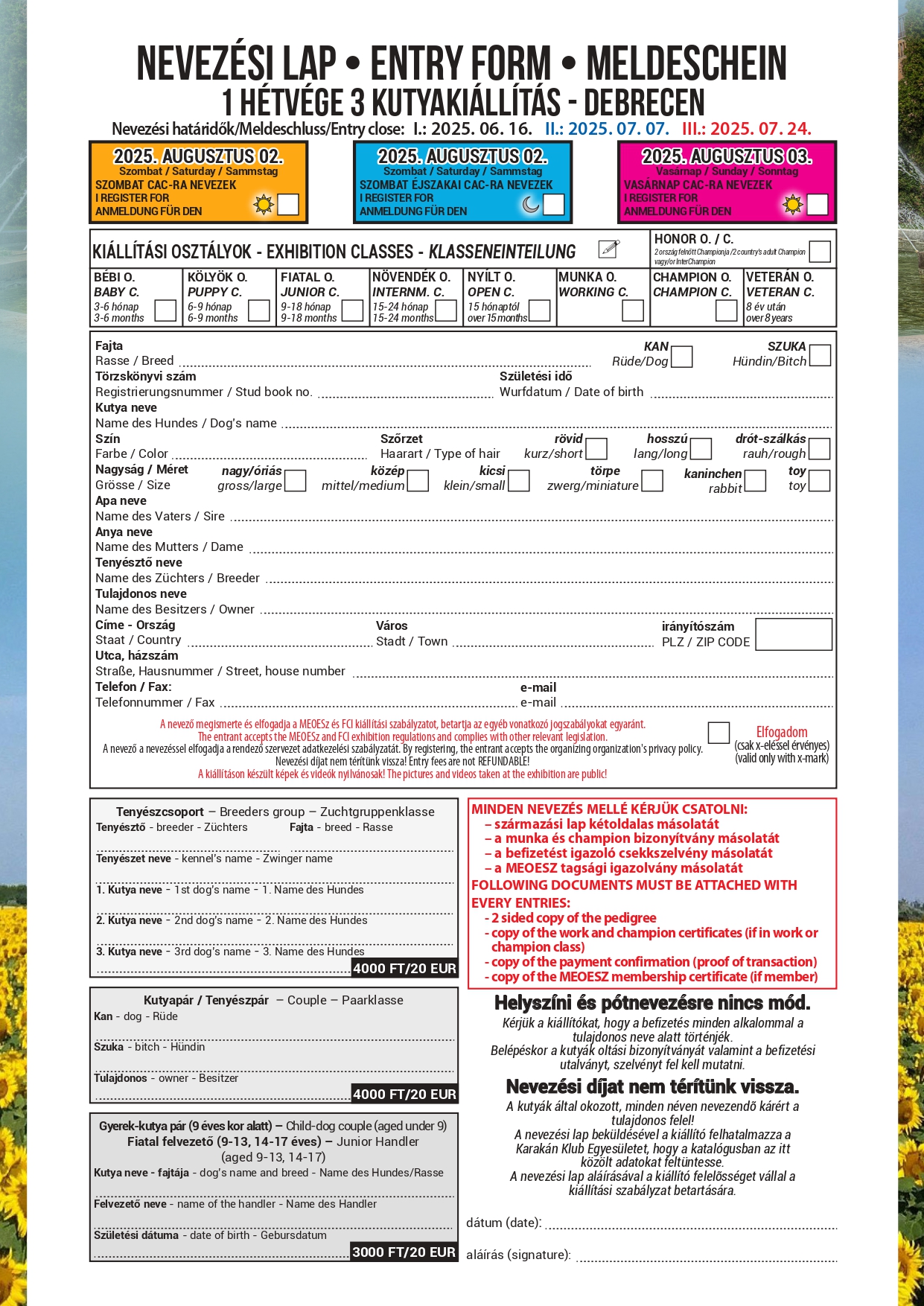 By submitting the entry form the exhibitor authorizes the Hungarian Kennel Club is to catalog the display of the data presented here.