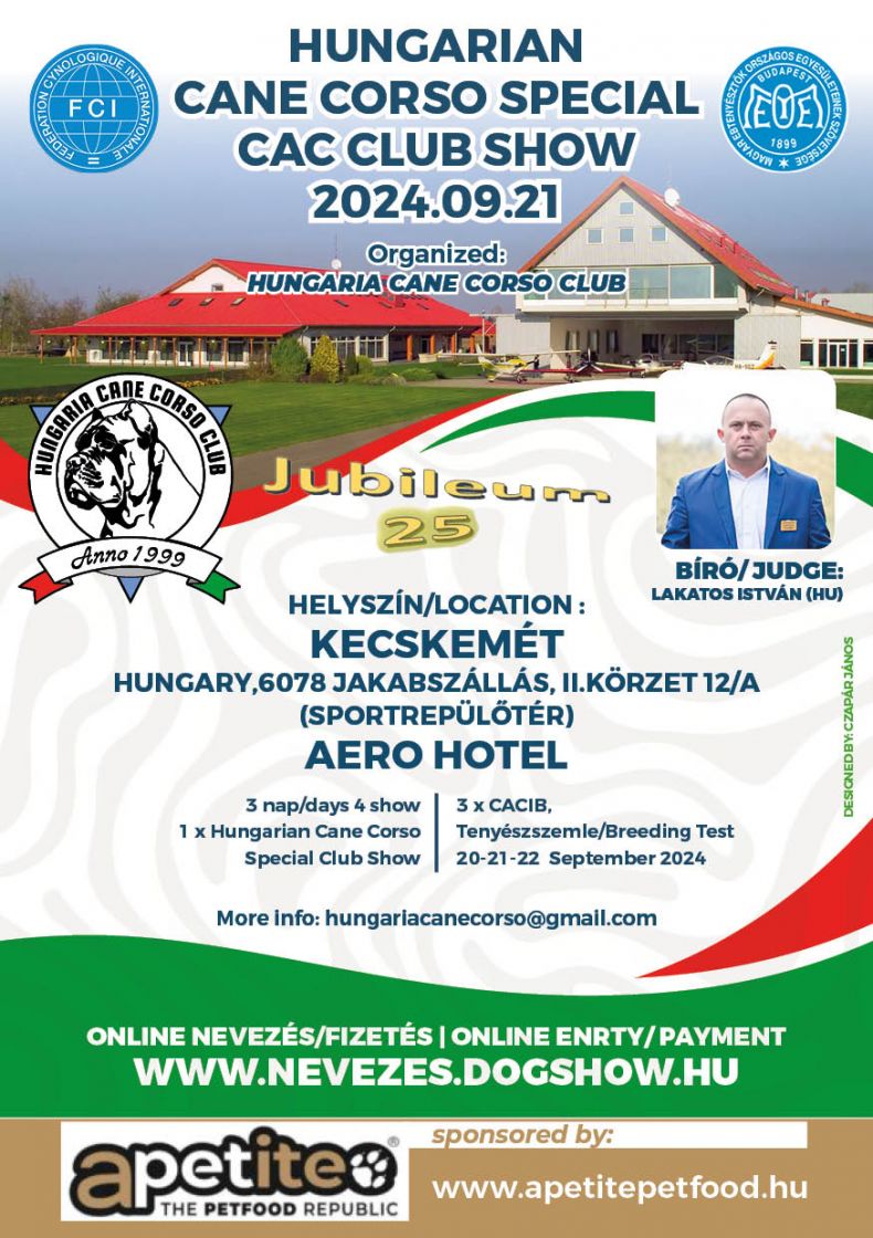 3 x CACIB International Dog Show will be held from 20th to 22th September (Friday, Saturday, Sunday) of 2024 in Hungary in the village Jakabszállás (17 km from city of Kecskemét). In 3 days 3 dog show waiting for the exhibitors Hungarian Champion titles with the possibility of obtaining. Venue: village Jakabszállás, Sport Airport of the Aero Hotel.