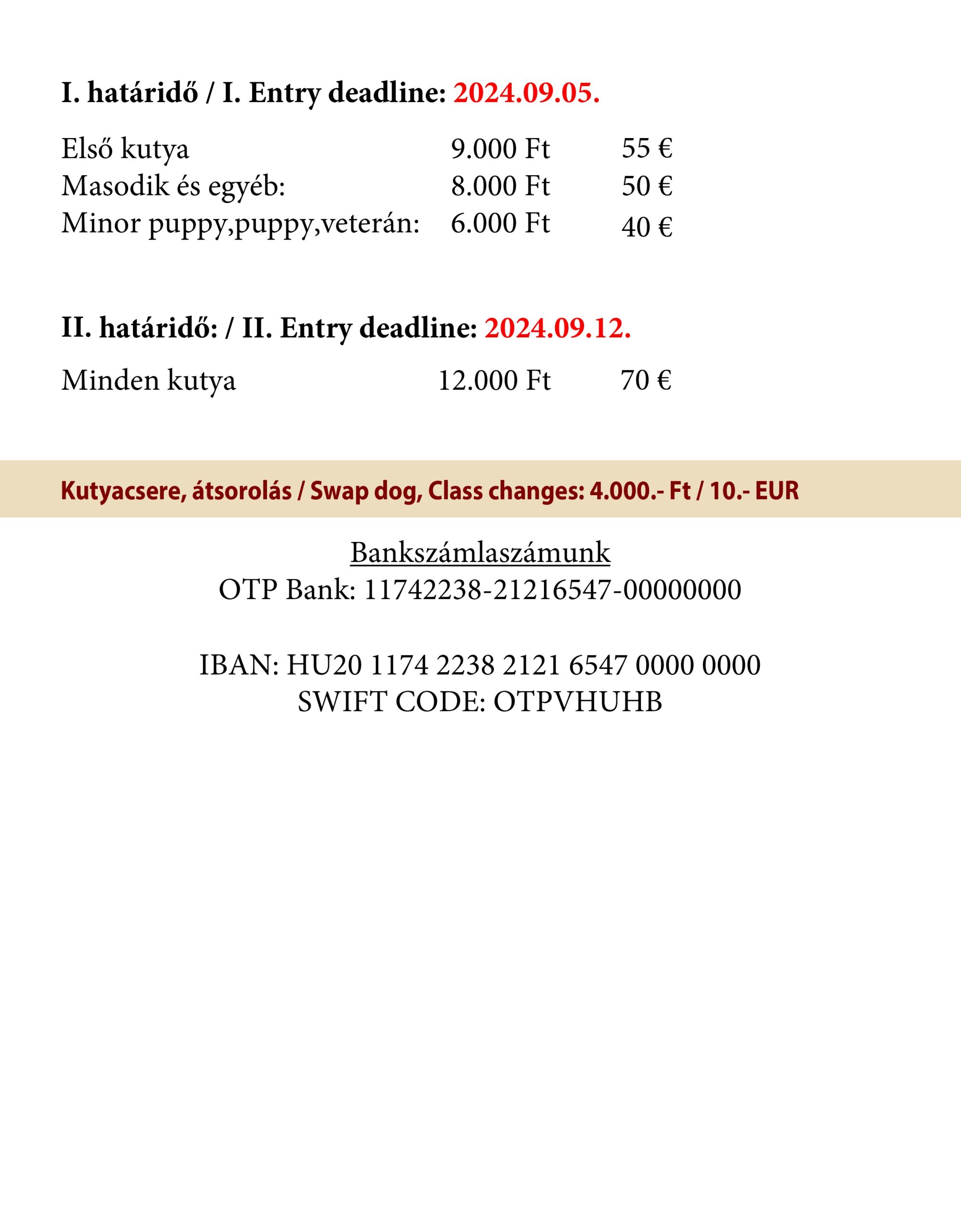 If you enter more dogs, the Minor Puppy, Puppy and Veteran classes entry fees is not counting as “First dog” in amount!