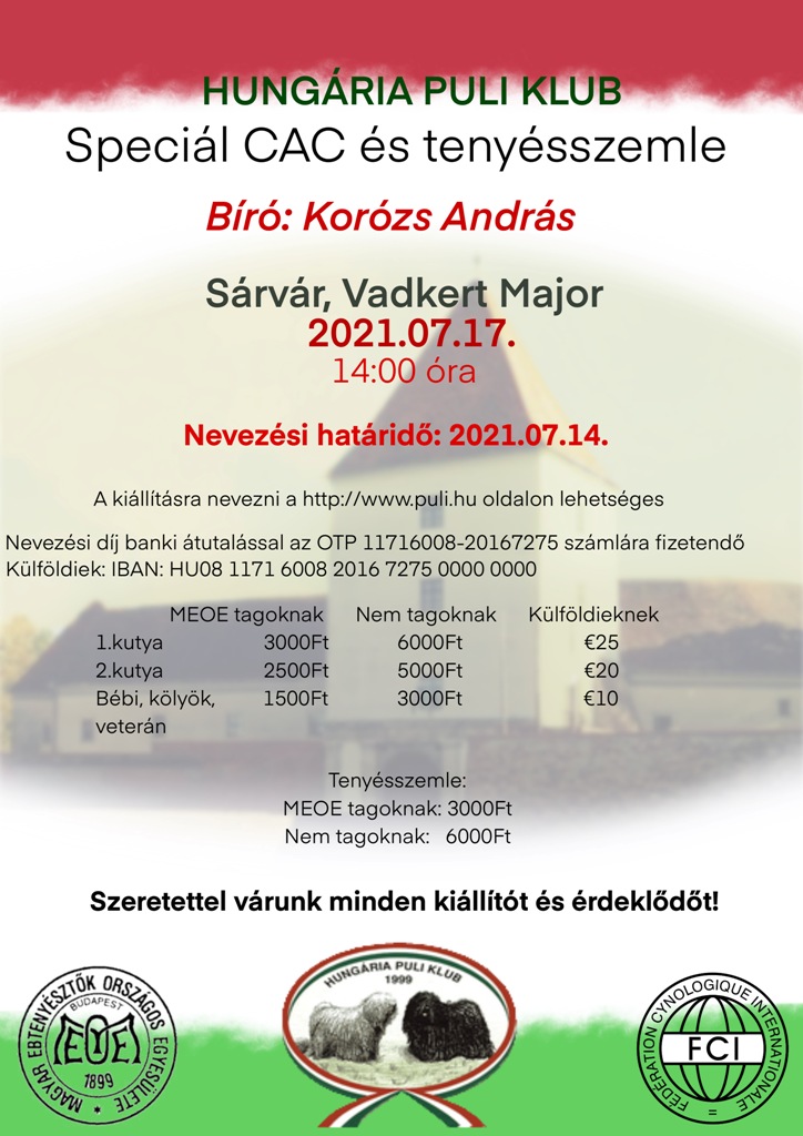 Attention! From 01. January 2021 only the hungarian registration dog ( with MET…. number) with hungarian address owner can pay hungarian forint entry fee , all other dog need to pay euro basis price. The Hungarian membership card is not valid for the foreign exhibitors, they can’t get discount from their entry fees for the hungarian CACIB and CAC show entry fees.