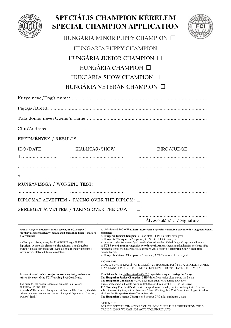 A helyszínen lehetőség van a speciál Champion bizonyítvány és serleg igénylésére és személyes átvételére, a speciál diploma ára serleggel: 15 000.- Ft.
