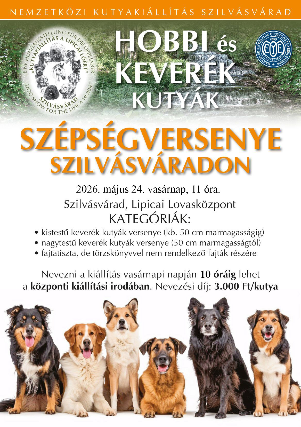 4 x CACIB nemzetközi kutyakiállítás kerül megrendezésre Szilvásváradon 2026. május 22-én, 23-án, 24-én és 25-én a Heves Megyei Ebtenyésztők Egyesületének és a MEOE Nyíregyházi Önálló Jogú Szervezetének jóvoltából. Az Egyesület a rendezvényen emlékkiállítással tiszteleg Korózs András előtt, a MEOESZ és a Heves Megyei Ebtenyésztők Egyesületének néhai elnöke előtt. A kiállítóknak a rendezvény 4 napja alatt lehetőségük lesz Speciál Champion címek megszerzésére! Helyszín: a Szilvásváradi Lipicai Lovas Stadion, Szilvásvárad, Szalajka út 2.