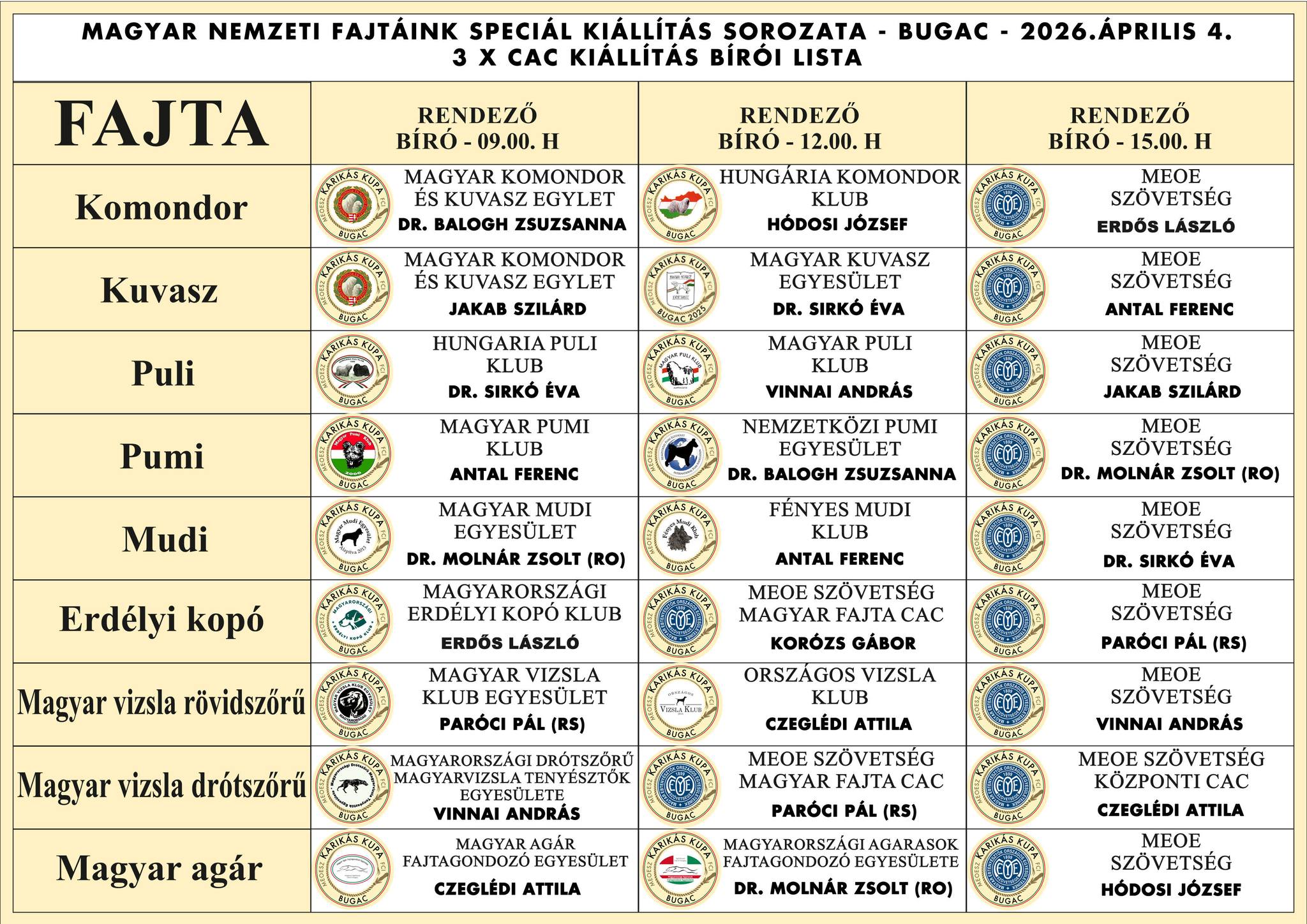 Karikás Kupa néven Magyar Nemzeti kutyafajták 3 x CAC kiállítására kerül sor 2026. április 04-én Bugacon a MEOE Szövetség és a a magyar fajták fajtagondozó egyesületeinek közös szervezésében. A három rendezvényen osztálygyőztes címet szerzett kutyák a korosztályuknak megfelelő Speciál Champion címet válthatnak ki. Nevezni csak a 3 kiállításra együtt van lehetőség. A kiállítók és a rendezők számára a parkolás díjtalan. Kezdési időpontok: reggel 09:00 óra, déli 12:00 óra, és délután 15:00 óra.