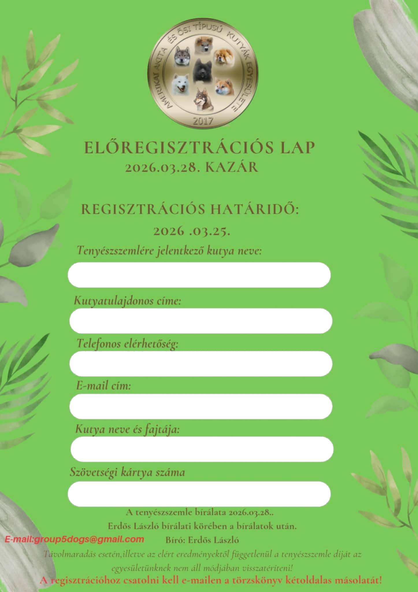 Regisztrációnál kérlek, add meg az aktuális évre vonatkozó tagsági viszonyod érvényességét igazoló szövetségi kártya számát a nullákkal együtt. Regisztráció, majd a személyes adatok illetve a nevezendő kutya/kutyák adatainak és dokumentum másolatainak (törzskönyv másolat első és második oldal, regisztrációs tagkártya másolata, Champion vagy Munkavizsga bizonyítvány, ha van illetve a befizetési csekk vagy banki átutalás másolata) felvitele után lehetséges az online nevezés indítása. A nevezés csak akkor lesz érvényes, hogyha a nevezés díja is rendezve van!