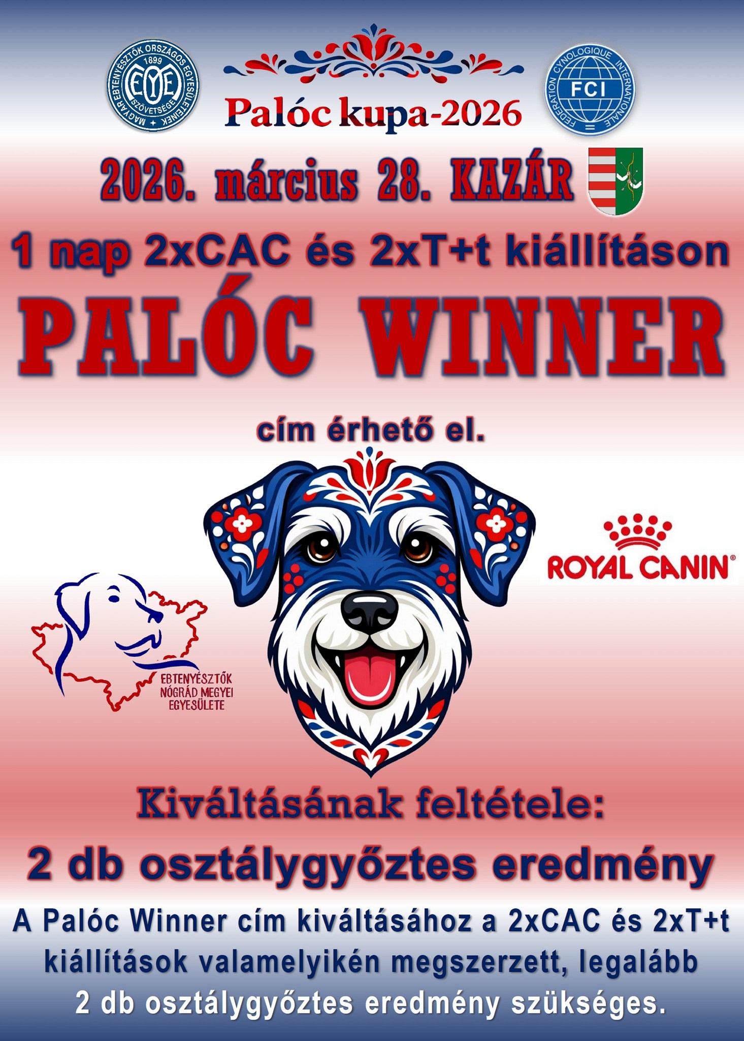 Az Ebtenyésztők Nógrád Megyei Egyesületének szervezésében Palóc Kupa néven 2 x CAC nemzeti kutyakiállítás kerül megrendezésre Kazár községben 2026. március 28-án, szombaton.