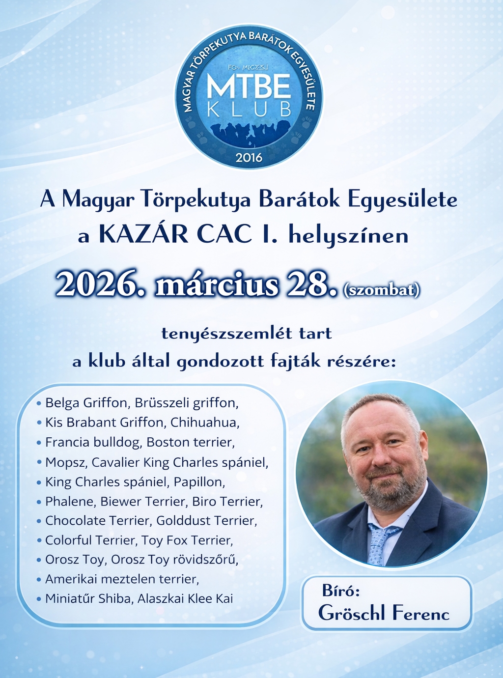 A Magyar Törpekutya Barátok Egyesülete tenyésszemlét tart a Klub által gondozott fajták részére.