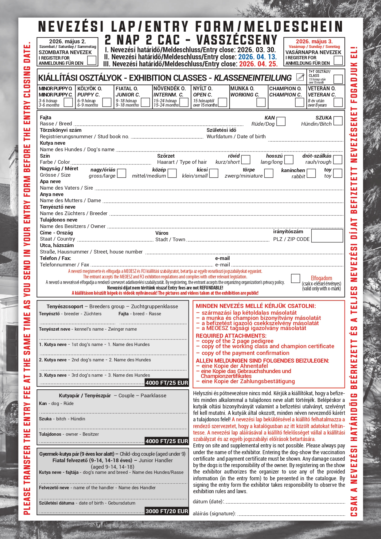 By submitting the entry form the exhibitor authorizes the Hungarian Kennel Club is to catalog the display of the data presented here.