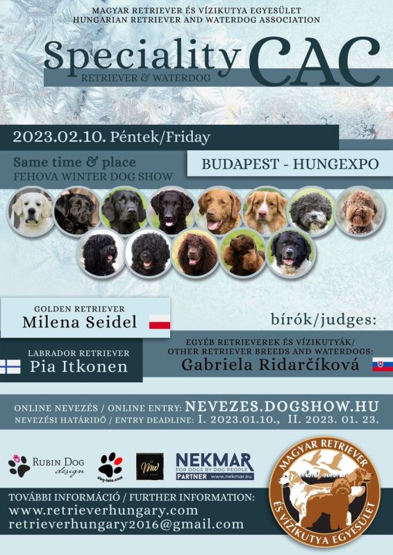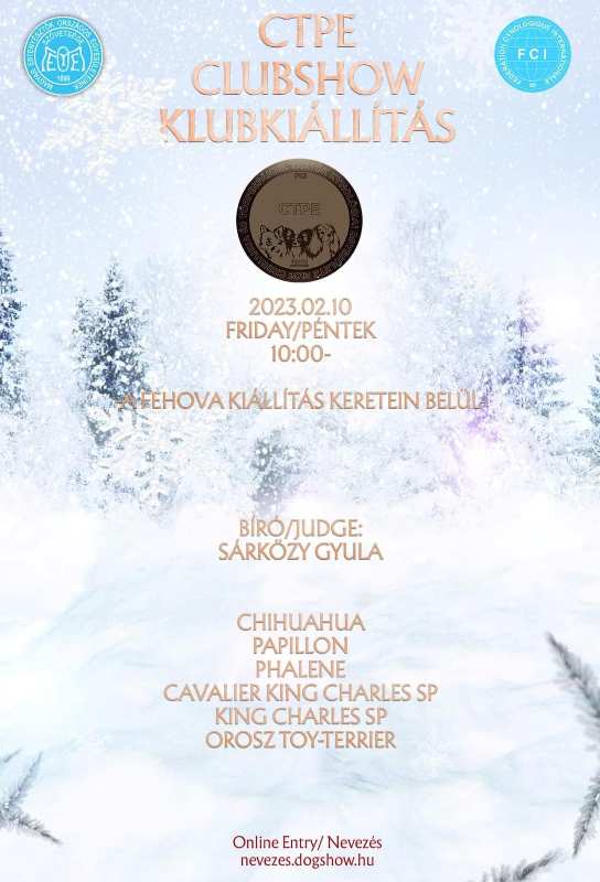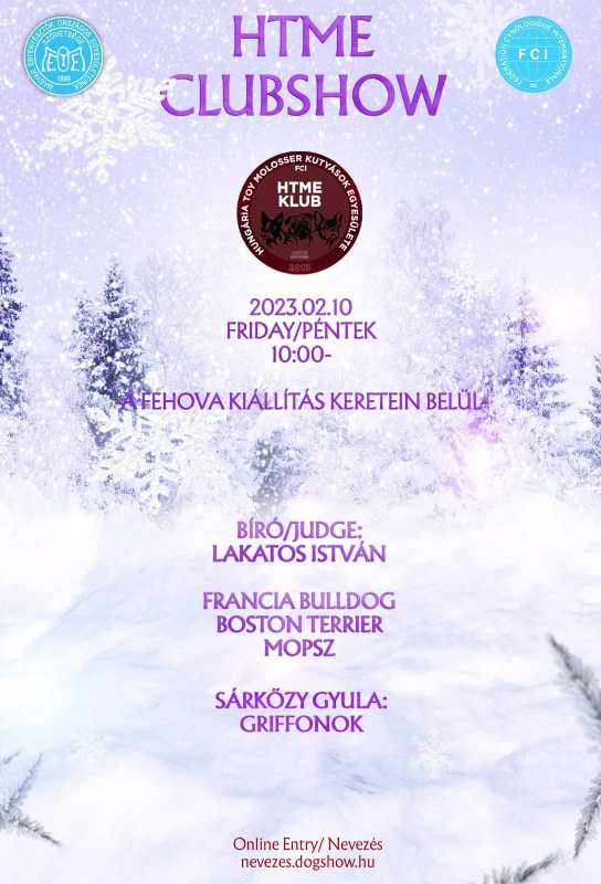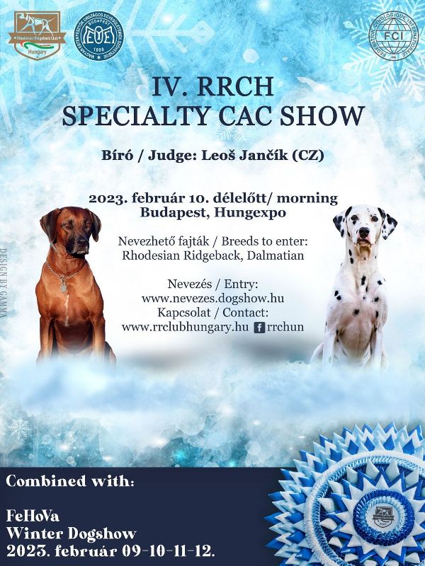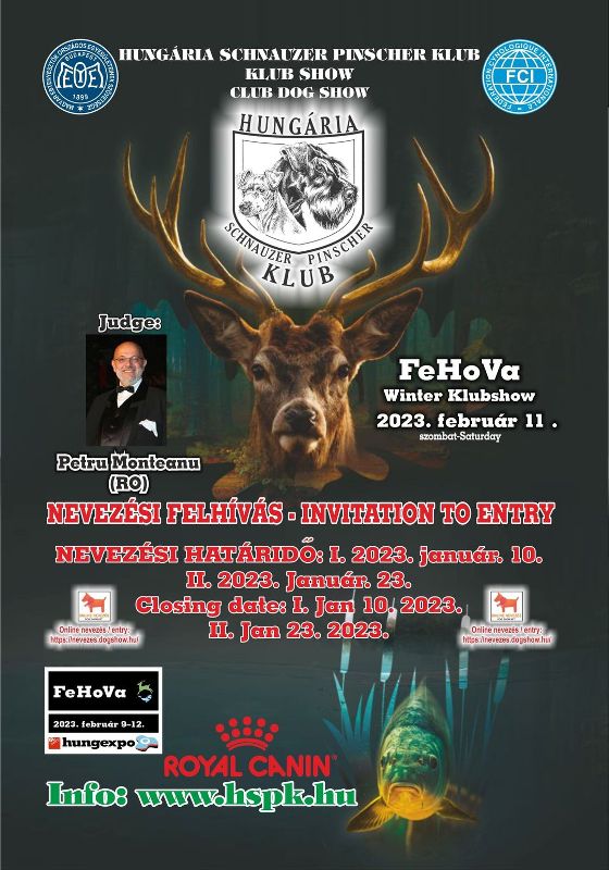 X. Jubiläums FeHoVa Winterhundeausstellung 3 x CACIB internationale Hundeausstellung findet am 9., 11., 12. Februar 2023 in Ungarn in Budapest statt, organisiert vom ungarischen Kennel Club. In 3 Tagen warten 3 Hundeausstellungen auf die Aussteller Ungarische Championtitel mit der Möglichkeit zur Erlangung. Die 3-tägige Ausstellung wird im Rahmen der internationalen Ausstellung FeHoVa (Waffe, Fischerei und Jagd) organisiert.